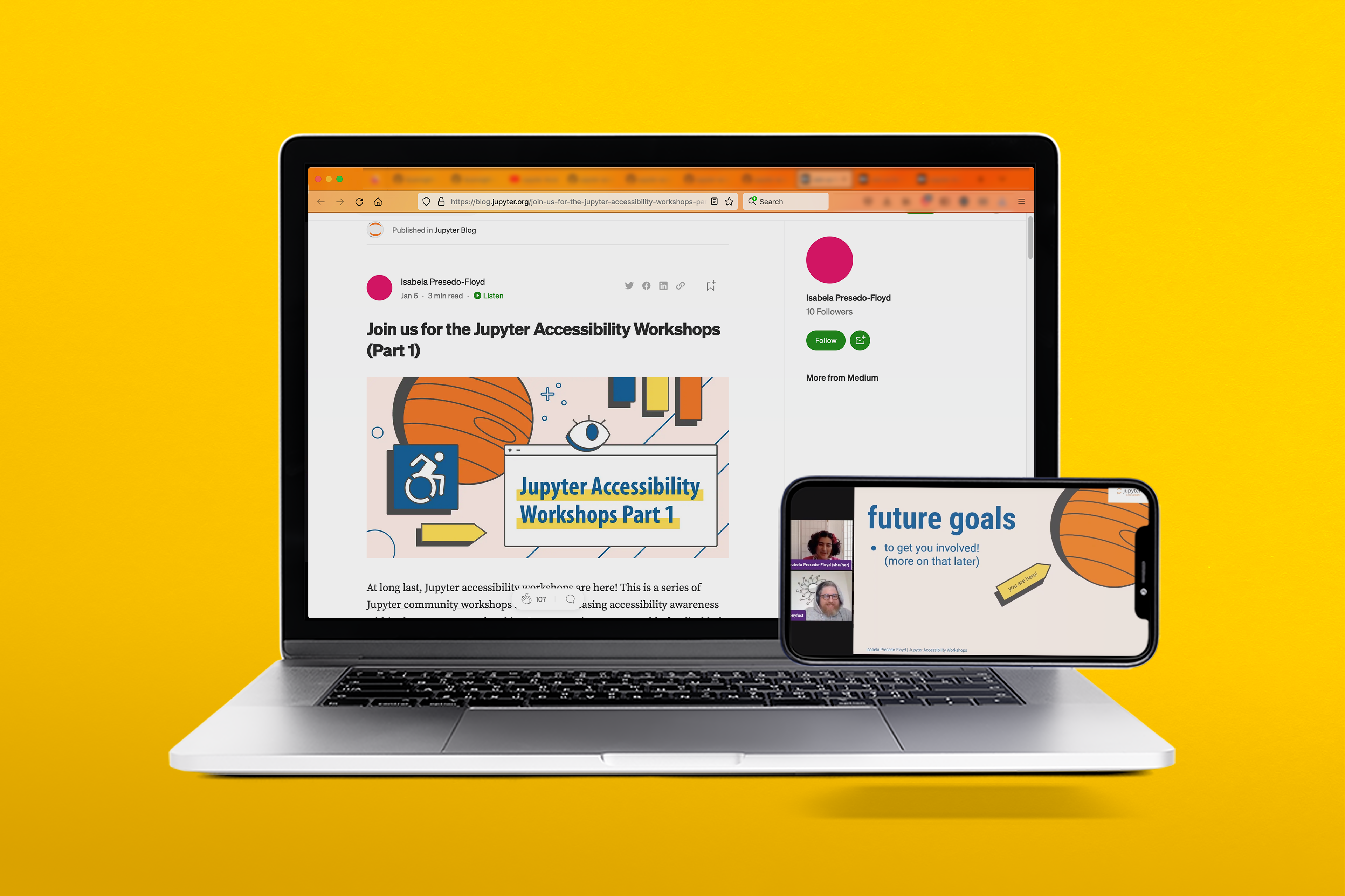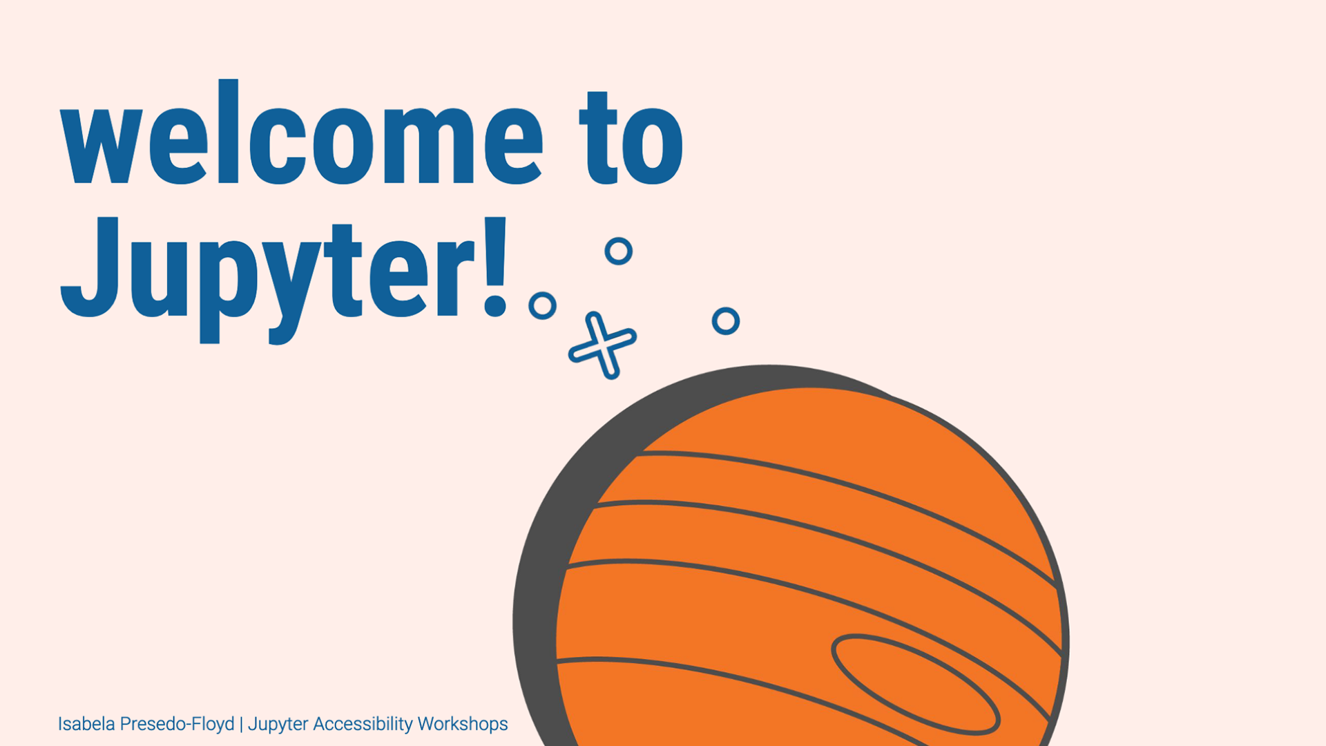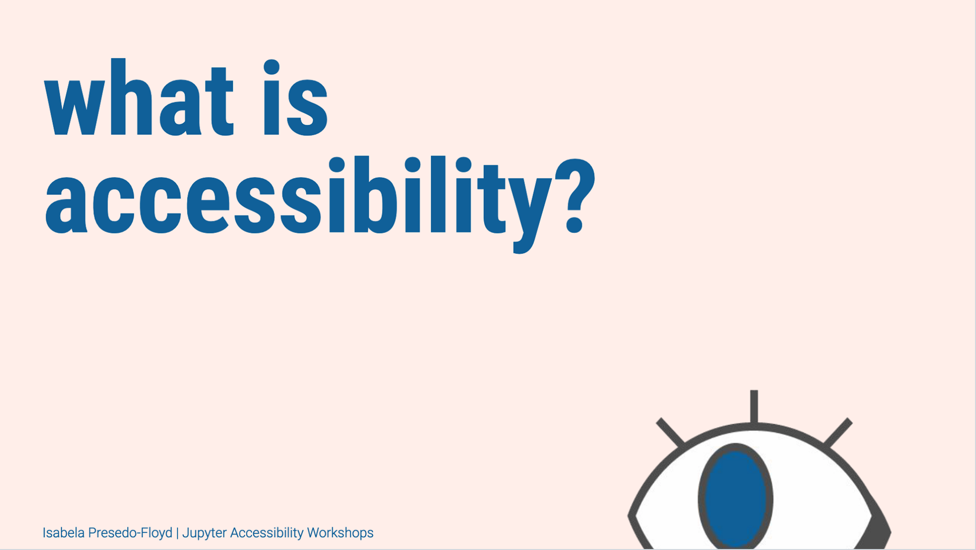 The Jupyter Accessibility Workshops were a series of public virtual events aimed at increasing accessibility awareness within the Project Jupyter ecosystem and making Jupyter projects more usable for disabled people. Lead primarily by myself, Tony Fast, and Tania Allard, we built upon existing accessibility efforts across the many Jupyter projects. For these events we emphasized on discussions around the Web Content Accessibility Guidelines and how to apply them in open source, scientific spaces where this work has historically been neglected.