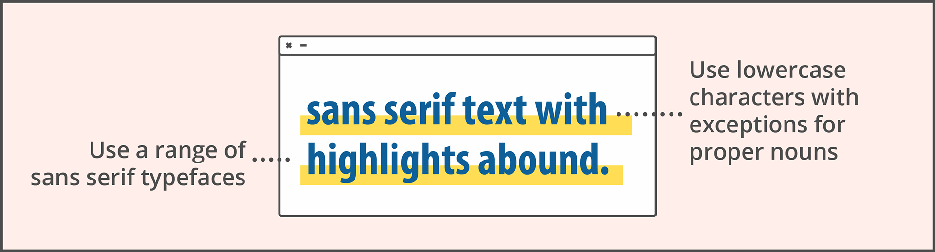Type: use san serifs. With a range of contributors on a range of platforms, determining a single typeface wasn’t helpful to our team. For stylistic reasons, we also used lower case characters with exceptions for proper nouns.