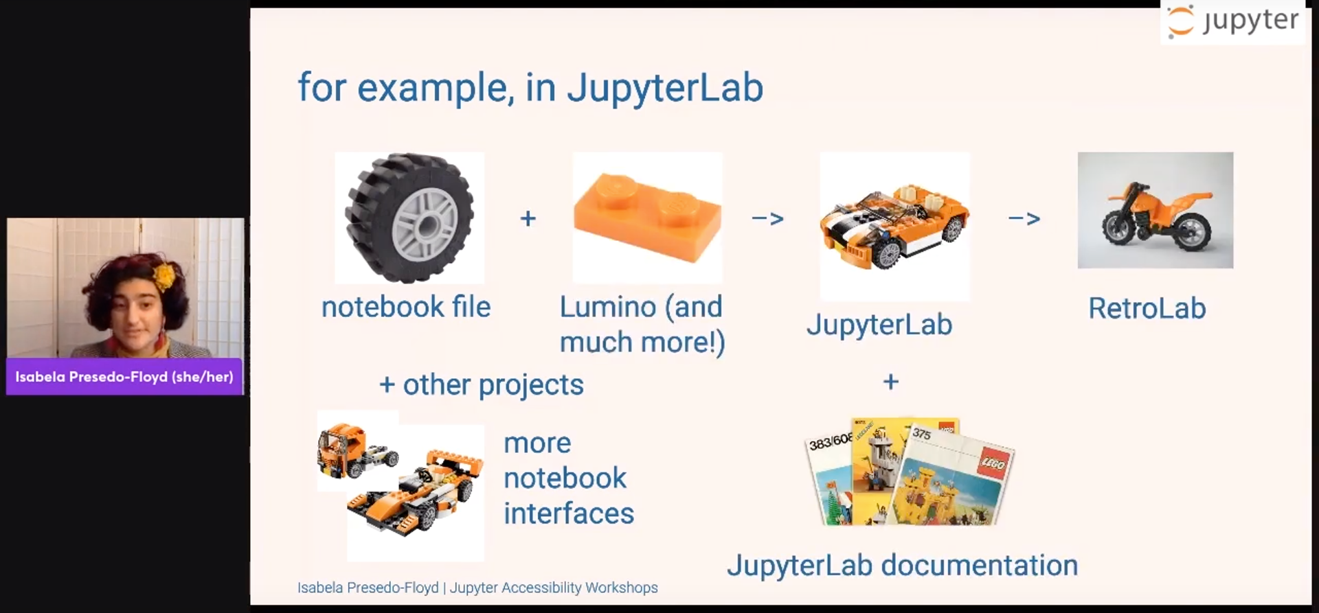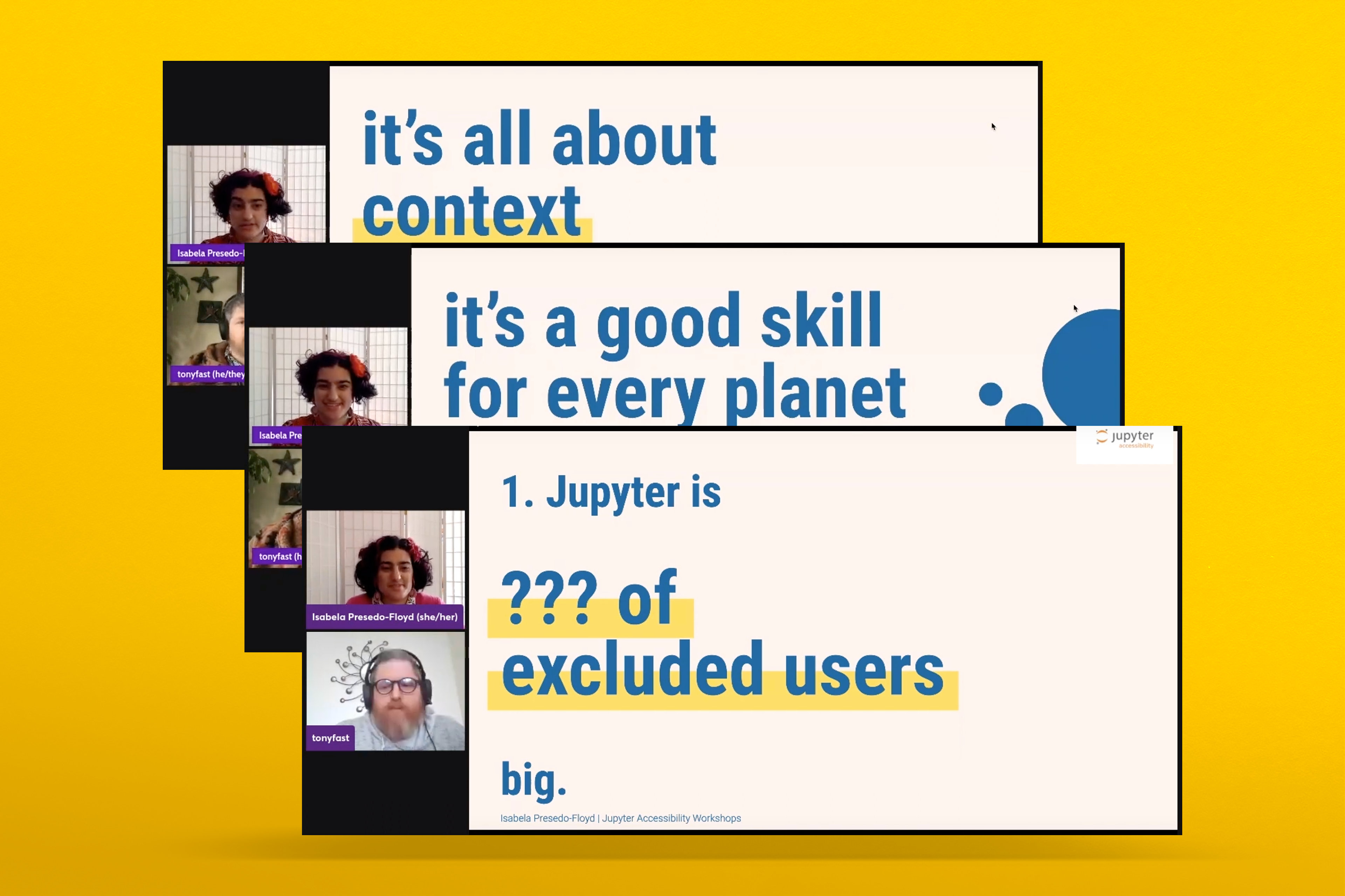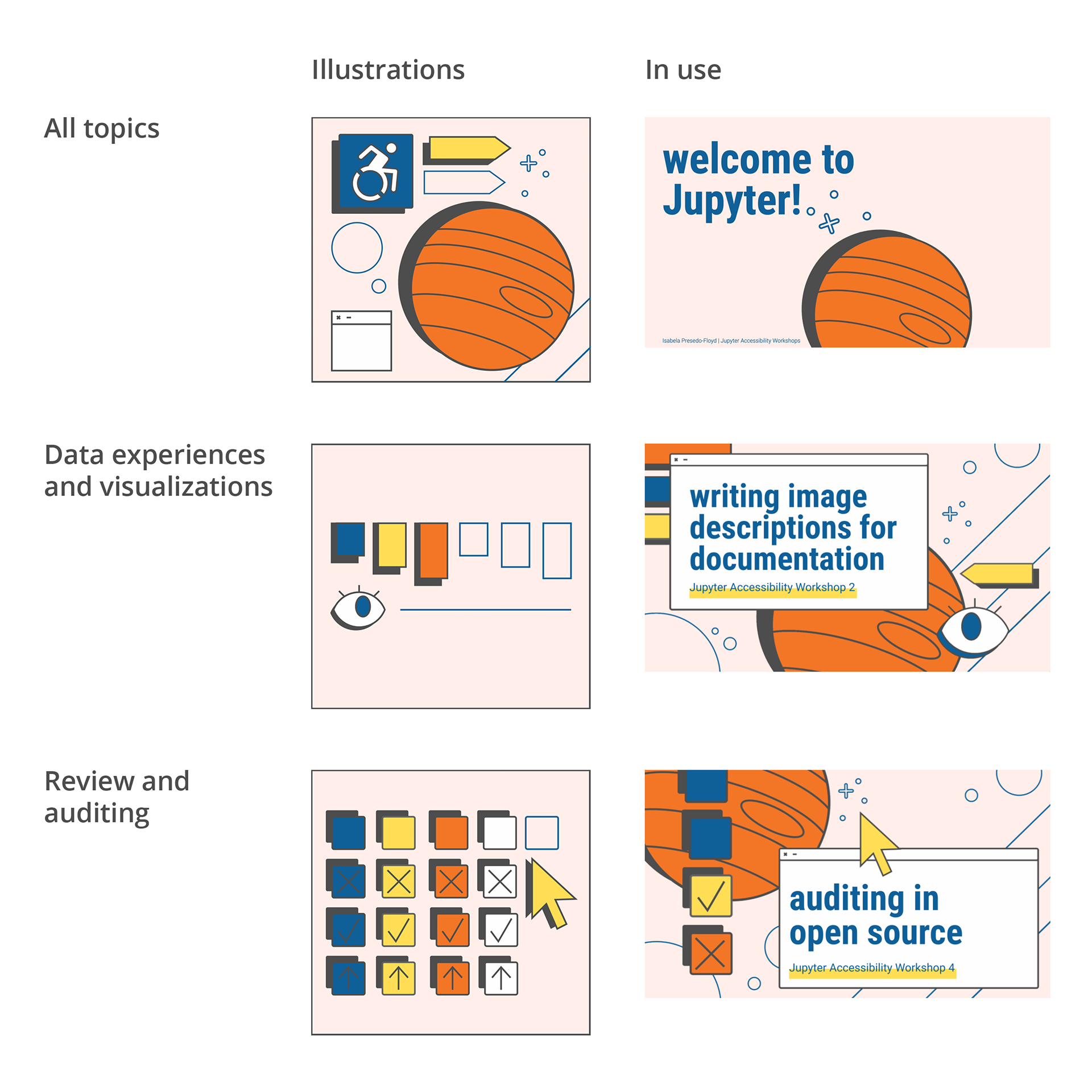 Combining the existing Jupyter brand with a unique and instantly recognizable set of visuals specific to the events, the Jupyter accessibility workshop visual design system is simple and modular. The visuals for this event were used throughout, from social media, blog posts, slide decks, video thumbnails, virtual hosting platform banners, and more.