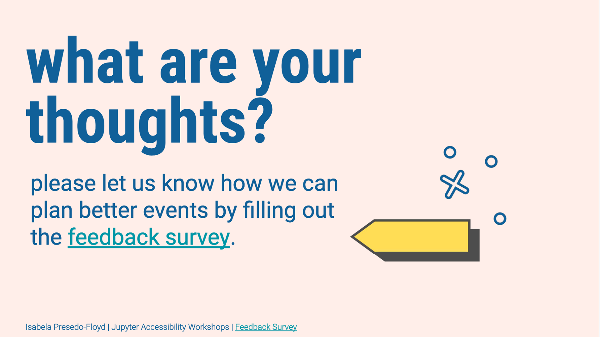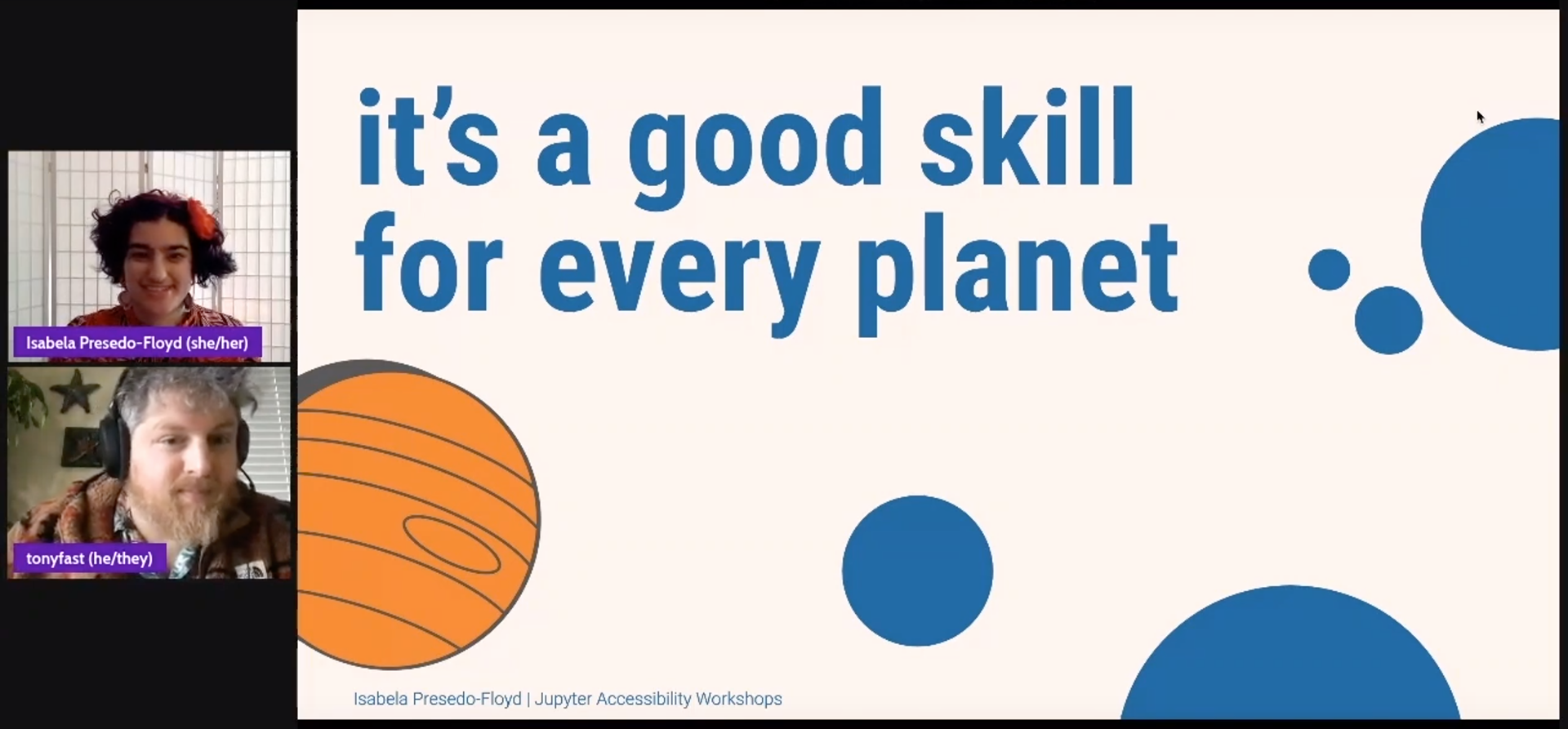 Accessibility efforts in the Jupyter ecosystem have been ongoing, but they are frequently on the sidelines. With the opportunity of Jupyter Community Workshops at hand, our team took the time to compare how accessibility work was currently distributed with how we wished the community was engaging. The difference between these two became the events’ cornerstones.