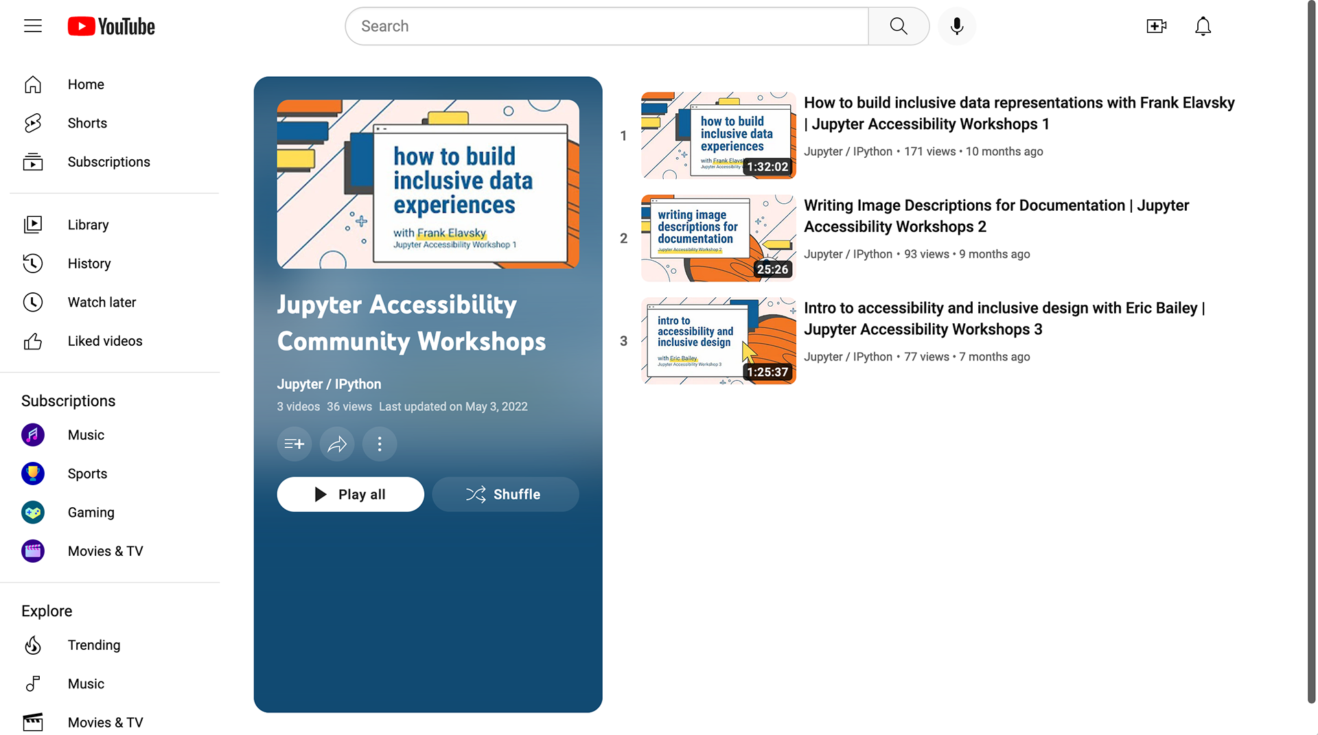 Events covered topics like accessible data experiences, writing image descriptions, inclusive design, and a review toolkit for digital accessibility. Before the event, these topics prompted new resources like an image description/alt text guide and checklist for review. These resources have since been used in projects outside the workshops and outside Jupyter.