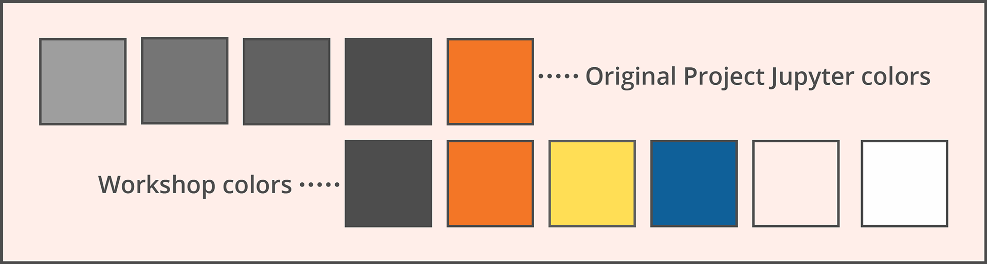 Color: use a bright palette rooted in the Jupyter brand. Extending the color palette also gave us many more options to combine colors and achieve accessible amounts of contrast, an issue the Jupyter brand struggles with.