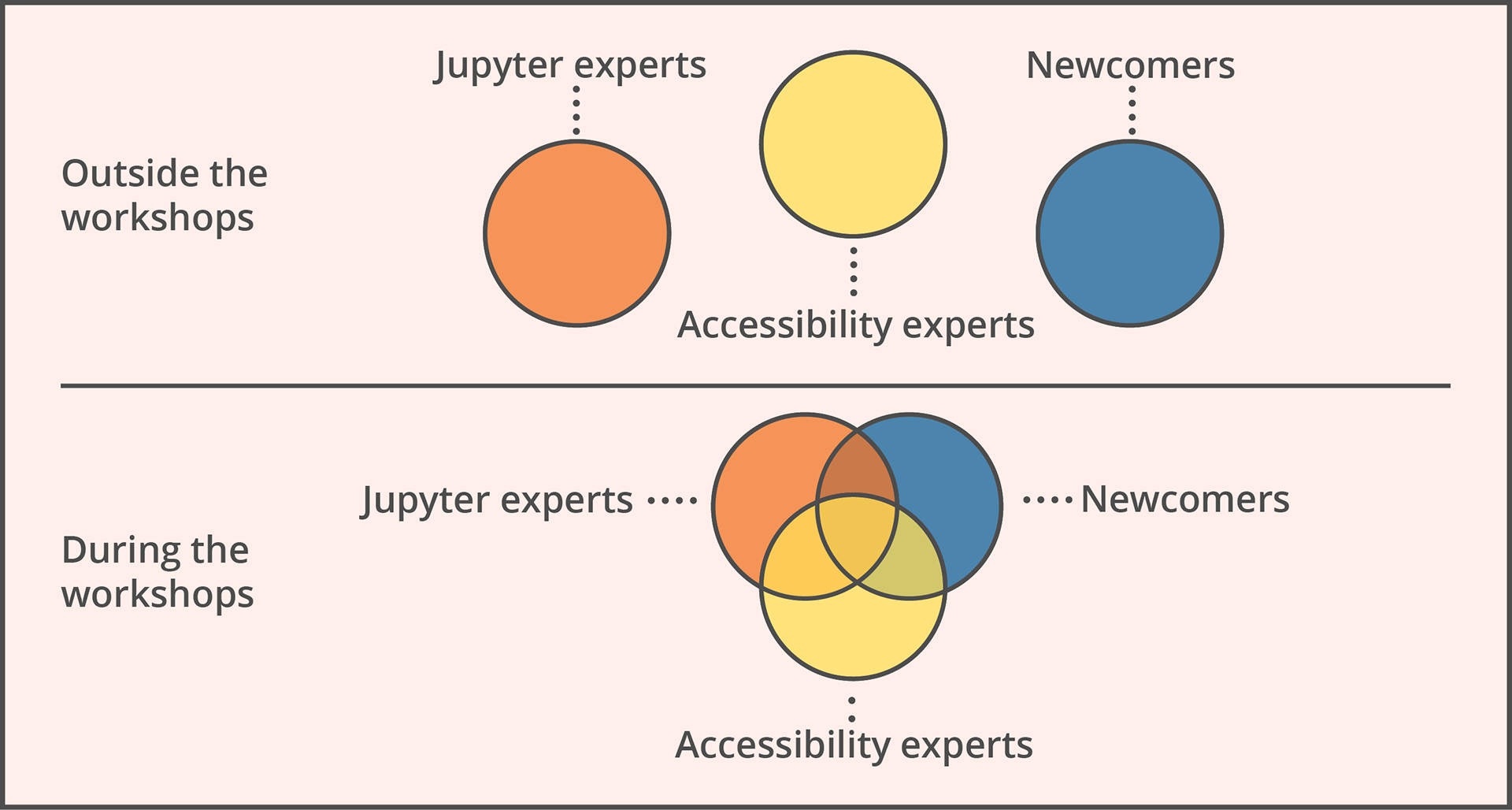 Jupyter accessibility workshops were structured around a two event cycle: the first event is informative and led by a non-Jupyter expert, the second event is for practicing these new learnings on real problems in the Juptyter ecosystem and contributing the practices as fixes to the software.